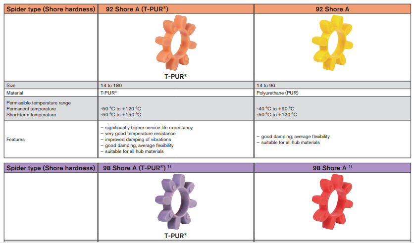 -Vòng đệm cao su giảm chấn (the elastomer Spider) của khớp nối Rotex  được làm từ vật liệu (T-PUR) độ cứng Shore chuẩn 92 Sh-A (màu Cam) độ bền cao.